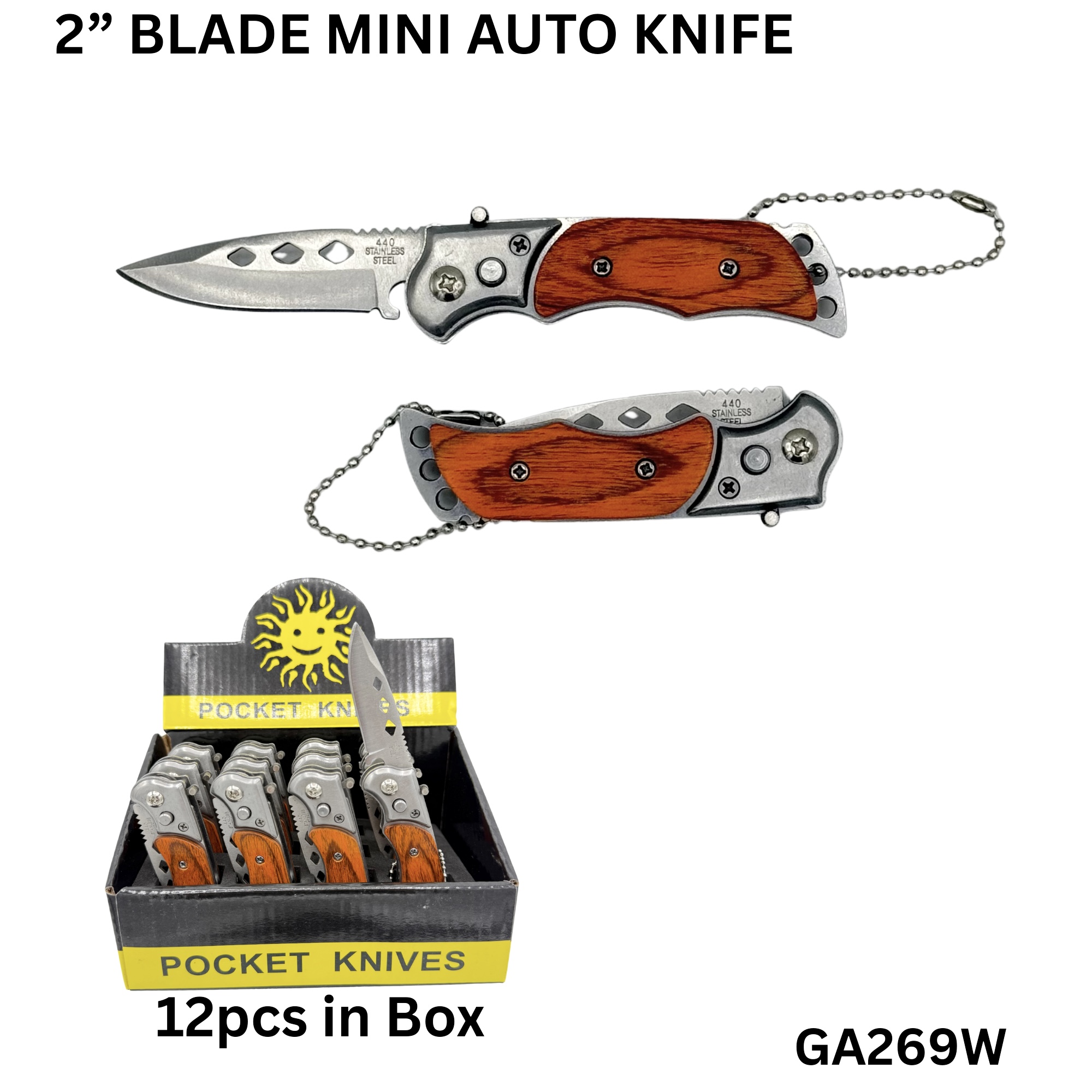 2″ blade, mini switch blade item, 12pcs in display box, GA269W stainless blade, stainless steel hanlde with red wooden slice, decorative folding pocket knife featuring intricate for a sophisticated look