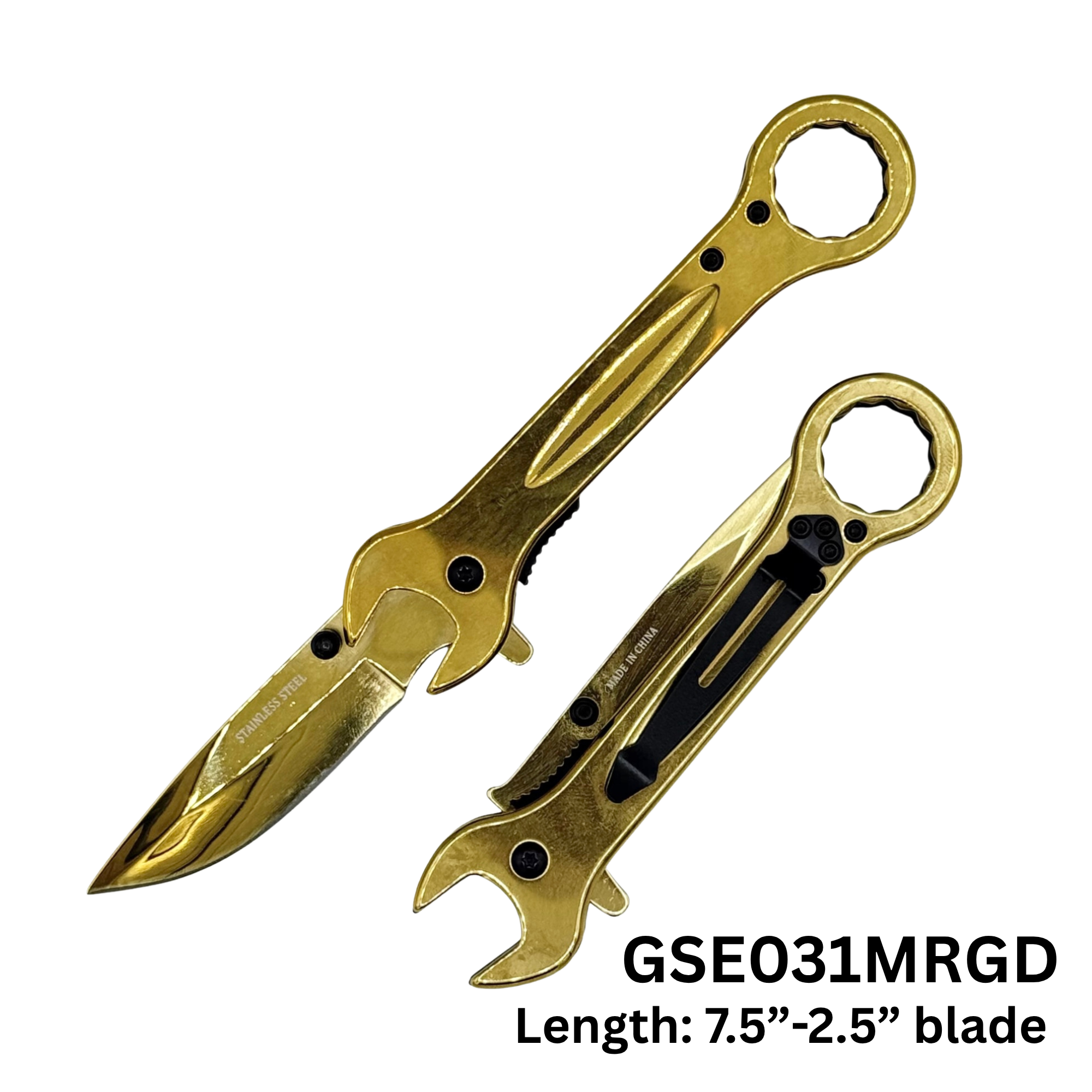 7.5” GOLD MIRROR FINISH POCKET KNIFE WRENCH STYLE, SPRING ASSISTED W/ CLIP