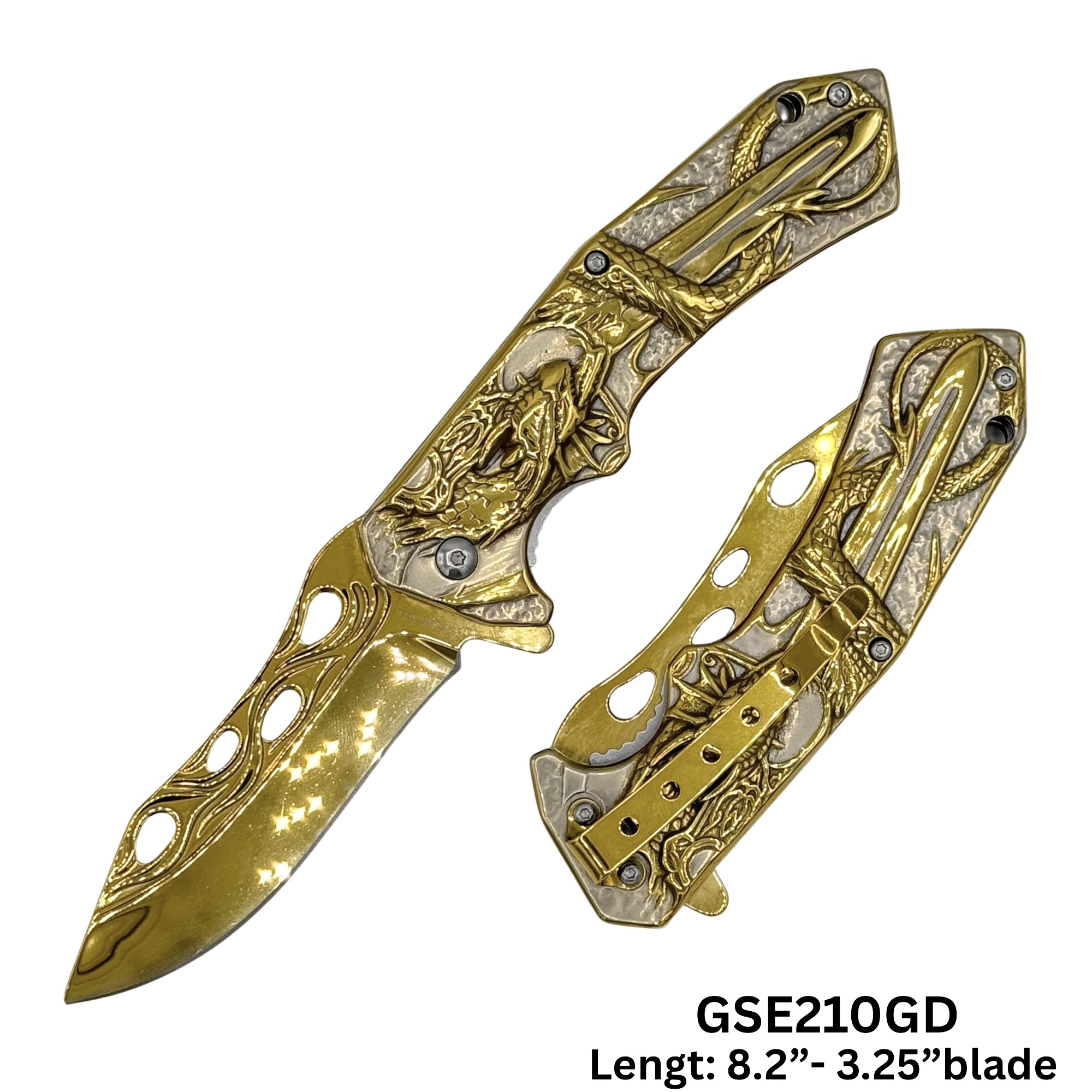 8.2” SA KNIFE ALL GOLD TITANIUM COATING, 3.9” BLADE W/ DRAGON & BLADE SCULPTURE, W/ CLIP