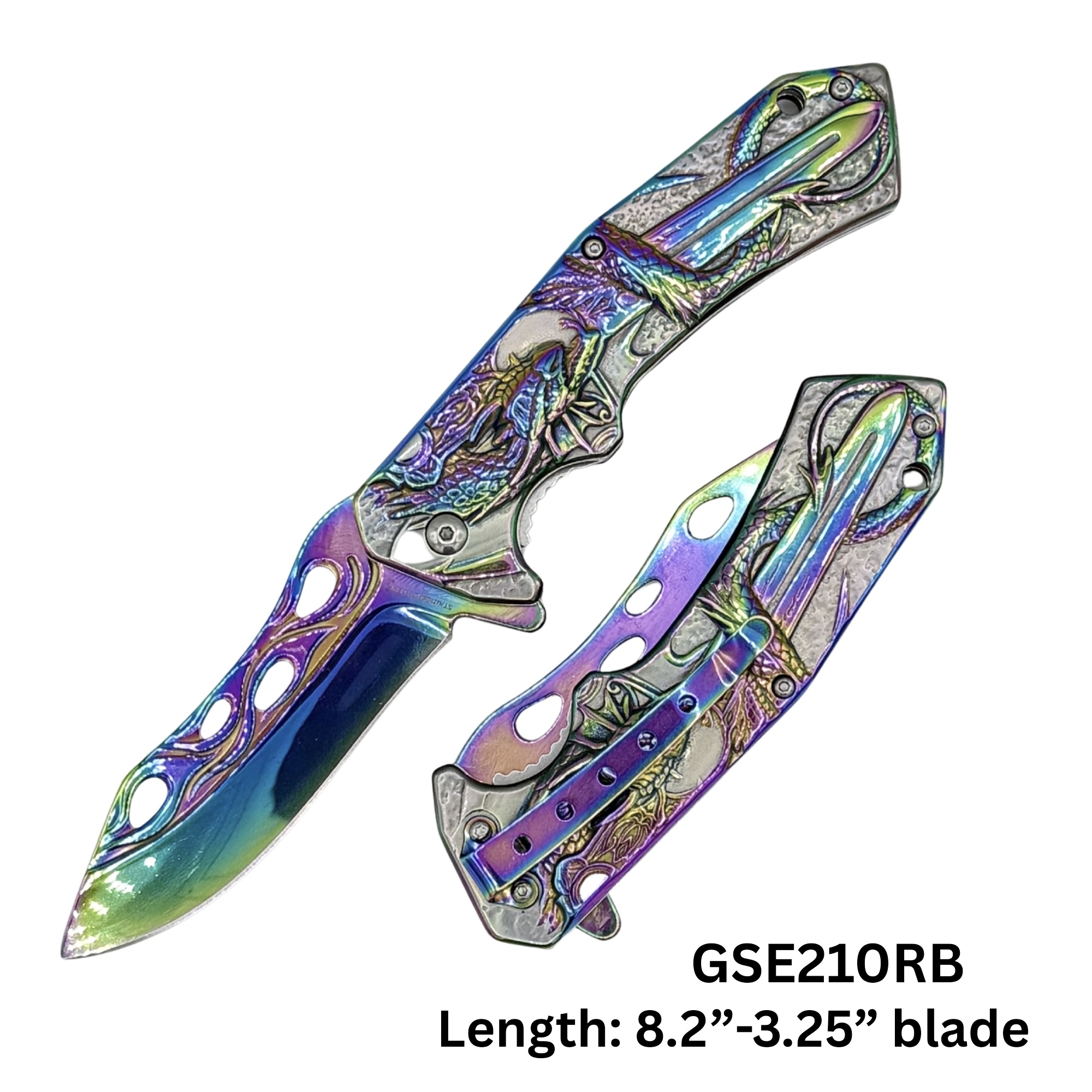 8.2” SA KNIFE ALL RAINBOW TITANIUM COATING, 3.9” BLADE W/ DRAGON & BLADE SCULPTURE, W/ CLIP