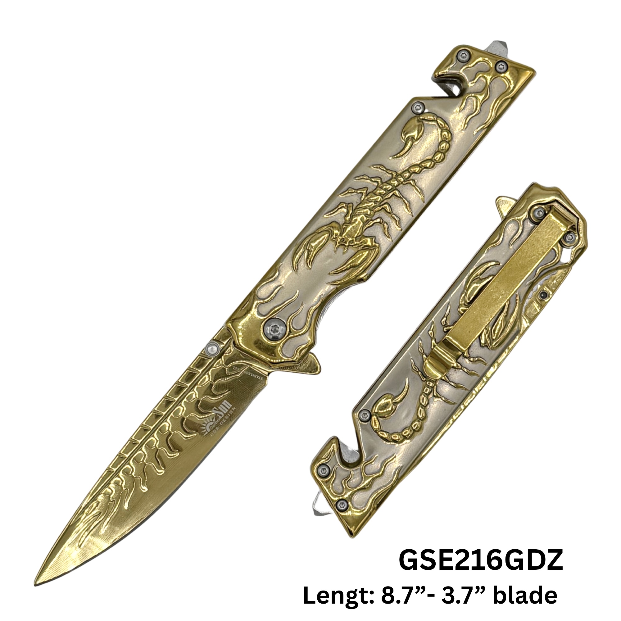 Elegant design, GSE216GDZ stainless blade, stainless steel hanlde, tatical folding pocket knife. Scorpion design.