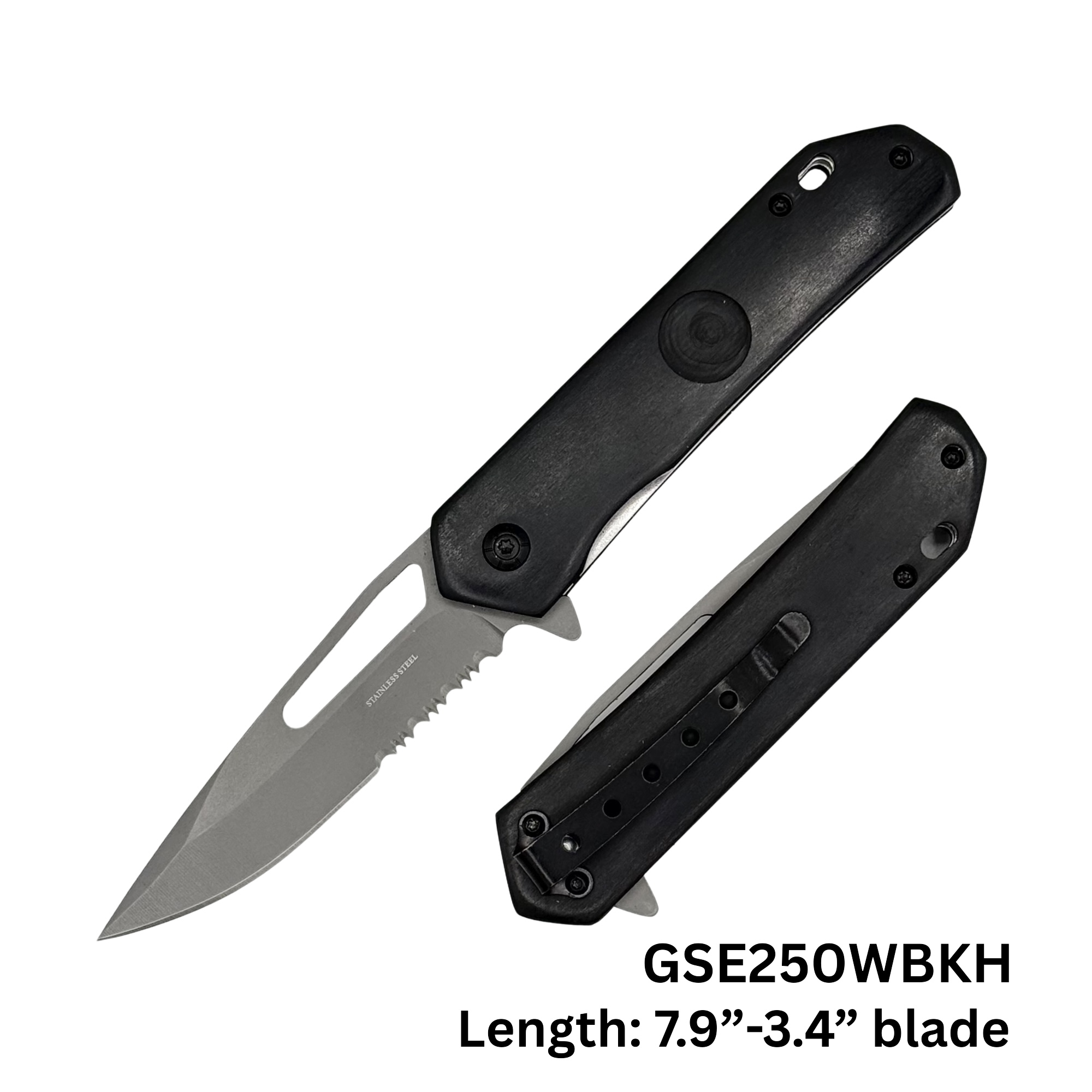 BLK WOOD HANDLE SPRING ASSISTED POCKET KNIFE W/ SERRATED BLADE.