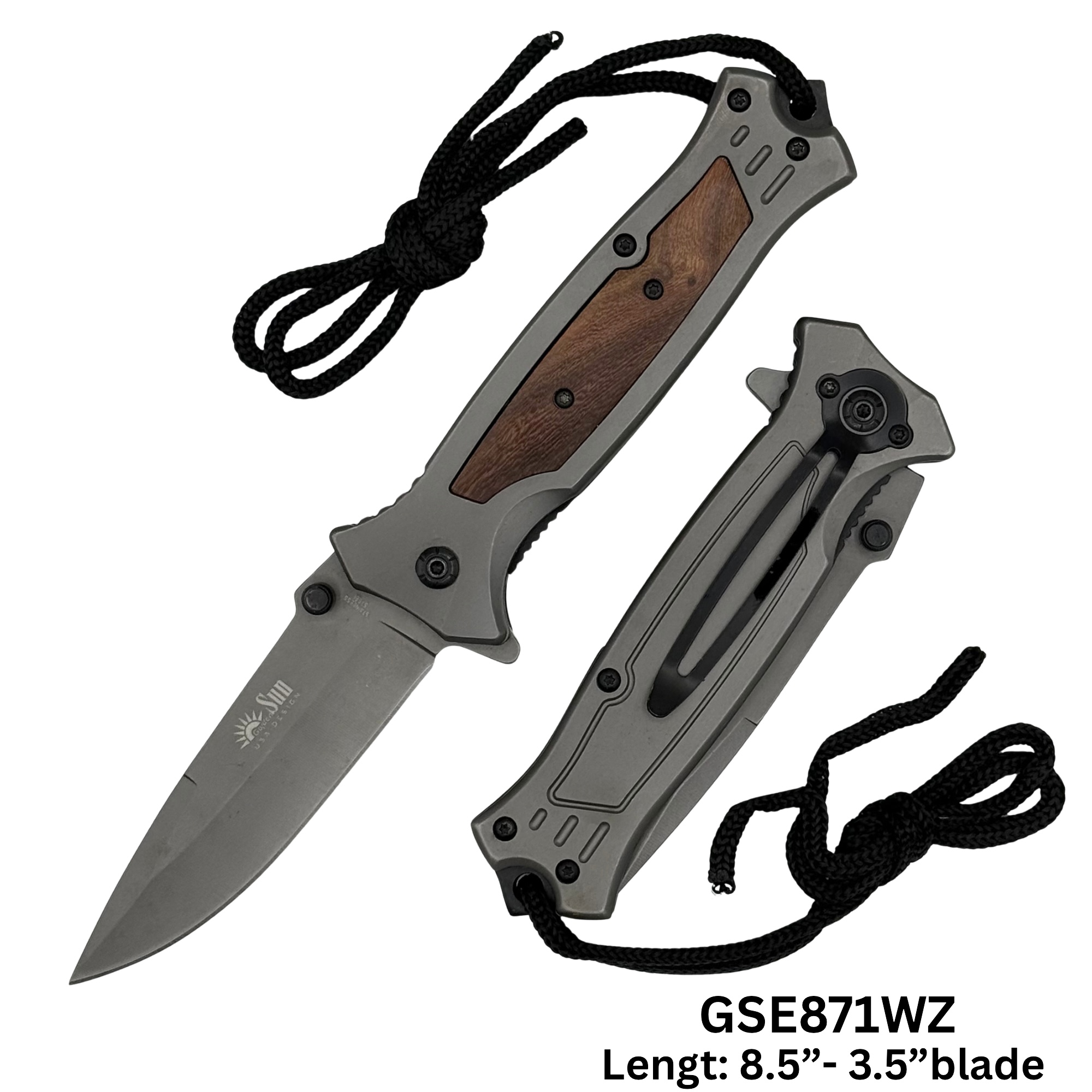 GSE871WZ stainless blade, wood handle W/ ROPE, sophisticated look with wooden slice on the handle & glass breaker